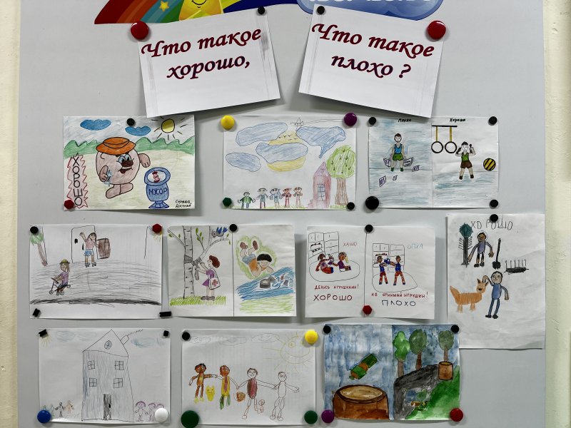 В рамках проекта « Что такое хорошо, что такое плохо?» в группе номер 9 совместно с родителями и детьми была организована книжная выставка «Книга учит добру», выставка рисунков, в которых дети вместе с родителями отразили хорошие и плохие поступки. На утренних беседах малыши вспомнили о правилах поведения в транспорте, в детском саду, на детской площадке. Совместно с воспитателем дети оформили плакат «Добрые правила».