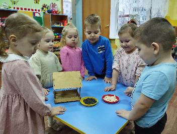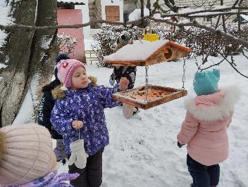 Во время прогулки дети насыпали корм в кормушку и с интересом наблюдали за прилетающими птицами.