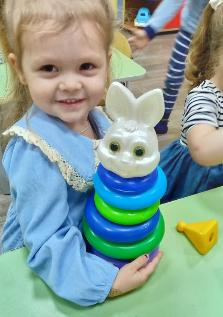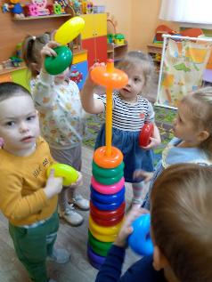 Малыши из младшей группы №1 «Кроха» в течение дня с интересом и удовольствием собирали и разбирали разноцветные колечки, стараясь соблюдать размер, чередование цветов. Особый интерес дети проявили к самой большой пирамидке, высотой 1 метр. В результате получились яркие и красочные пирамидки.