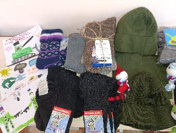 шерстяные носки (12 пар), 3 шапки. Участвуя в патриотической акции,