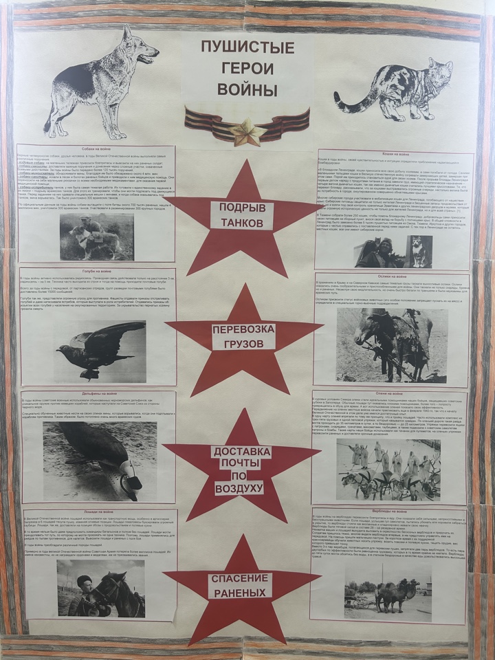 Вторая Мировая Война оставила неизгладимый след в истории нашей Родины. В это страшное время наш народ проявил немеренную отвагу и мужество! Но мало кто знает, что в то время бок о бок с солдатами гордо и отважно сражались братья наши меньшие. Ребята старшей группы «Звездочки» создали и презентовали плакат о сильных лошадях, смелых собаках, ловких кошках, быстрых голубях, а еще о дельфинах, мышах, оленях,верблюдах, осликах и лосях, которые, как и люди совершали подвиги, спасая тысячи человеческих жизней и помогали приблизить долгожданный День Победы!