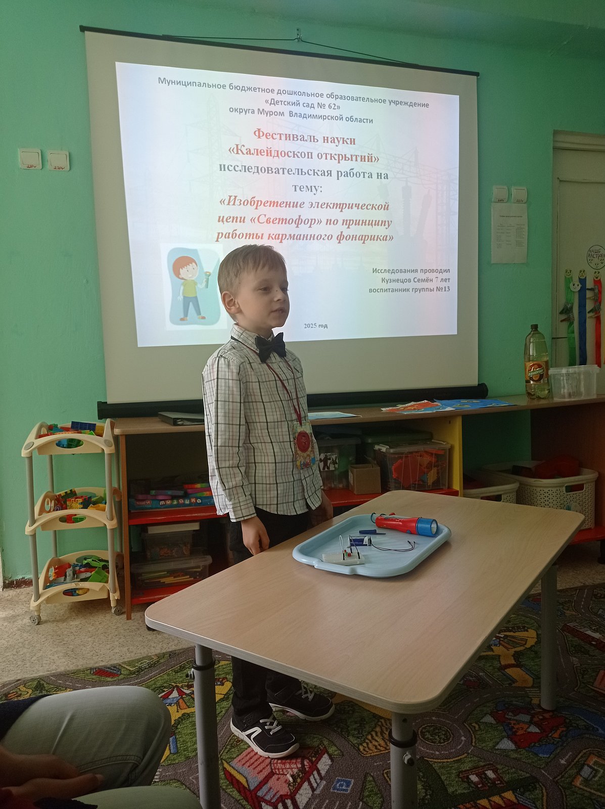 Семён представил свою работу «Изобретение электронной цепи "Светофор" по принципу работы карманного фонарика" и занял 1 место в секции "Мир детских изобретений".